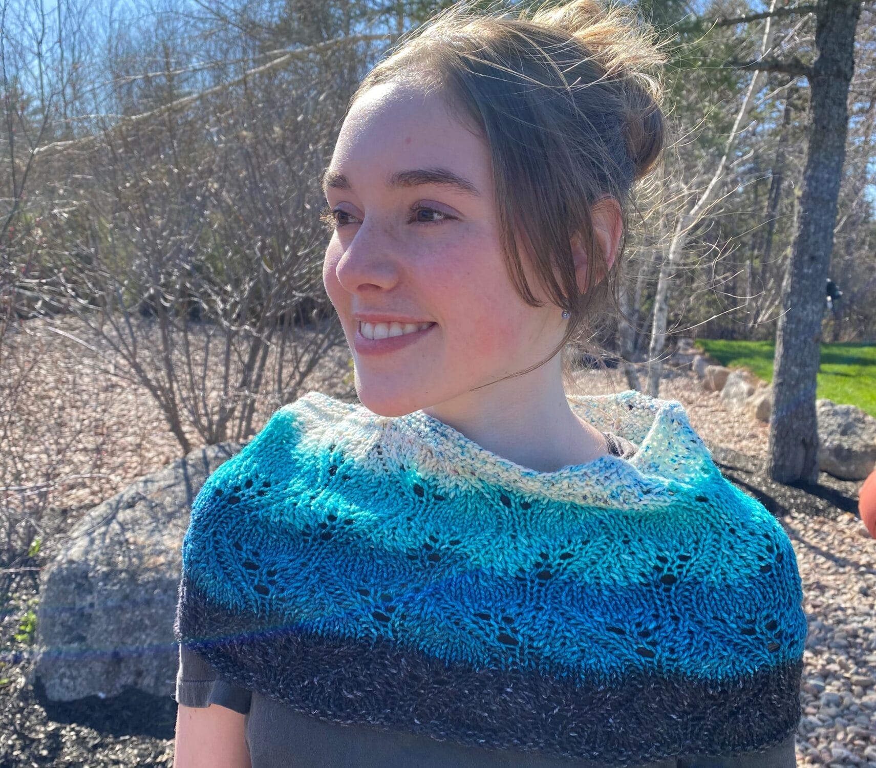 Yarn: 135g, worsted weight yarn – Shown in Nerds With Needles ombre fade in Coastline, 100% SW Merino