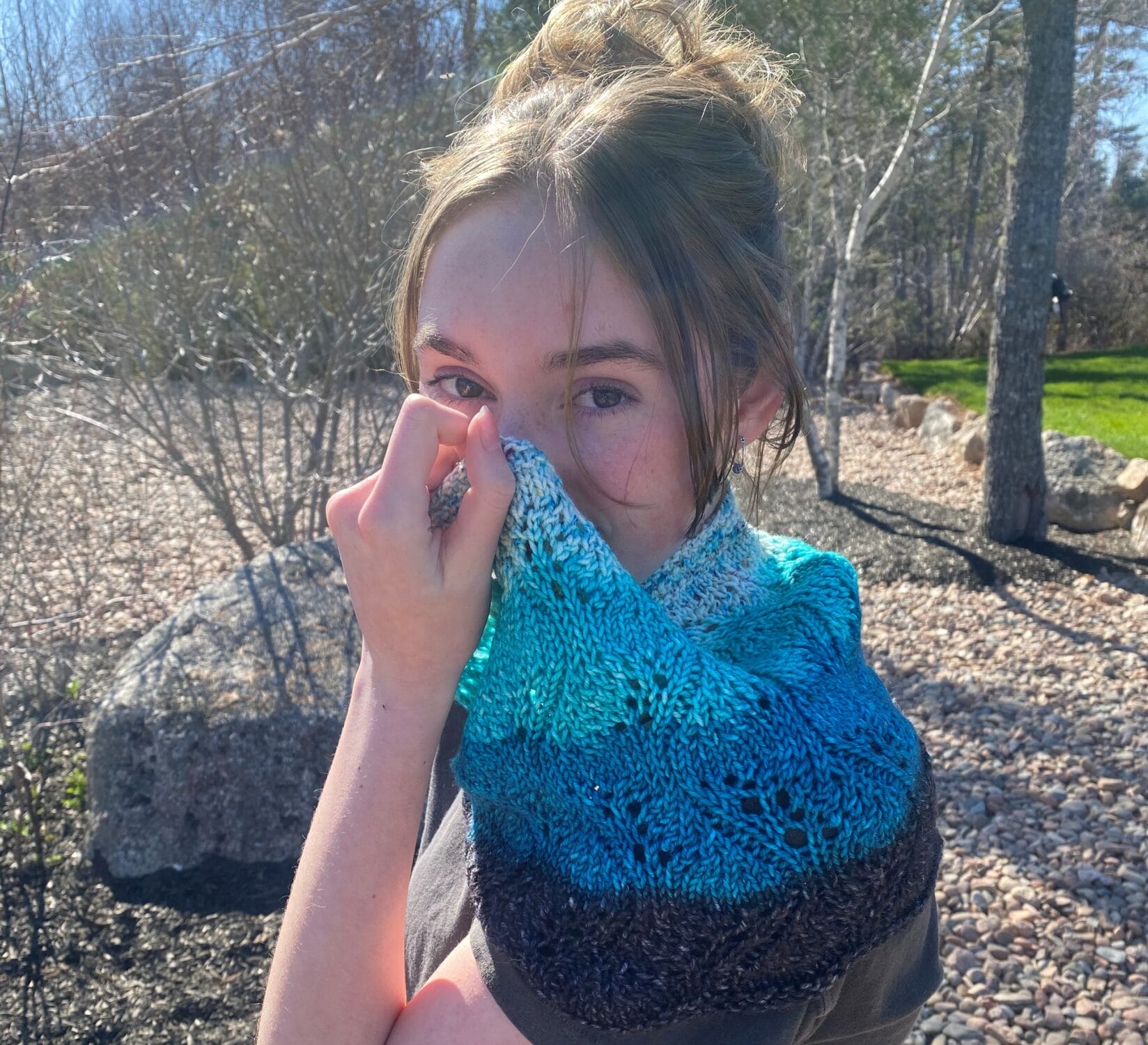 This sample was knit with Nerds With Needles colourway “Coastline”, signifying the blue and white crested waters breaking over the black rocks, it was fitting to add the subtle curving waves and water movement in the pattern. This cowl is knit in the round with one skein in worsted weight yarn that is slightly larger than typical, however there are directions to make it with a standard skein.