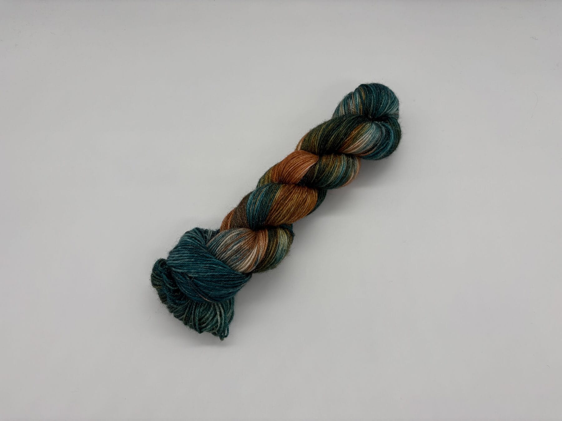 The skein showcases a rich palette of earthy browns, golden ochres, and deep teals, reflecting Toph’s connection to the earth and her unyielding determination. The subtle blending of tones captures the duality of strength and grace, making this yarn perfect for projects that demand both structure and beauty.