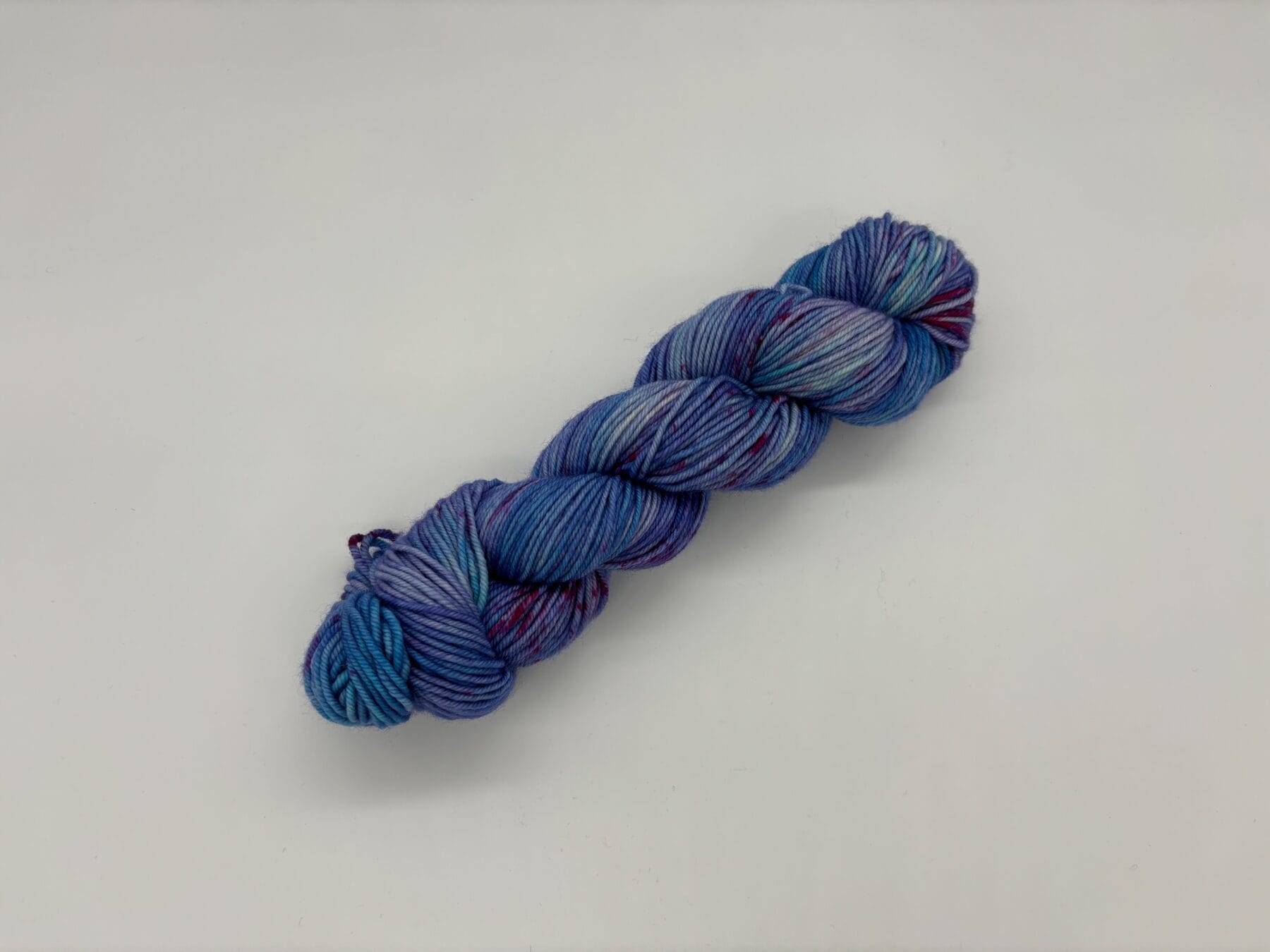 Introducing Fairy Godmother, a spellbinding hand-dyed yarn by Nerds With Needles in Nova Scotia. Inspired by the magic and whimsy of fairy tales, this enchanting skein blends dreamy shades of violet, periwinkle, and turquoise, with delicate splashes of berry and wine, evoking the twirl of a wand and a shimmer of stardust.