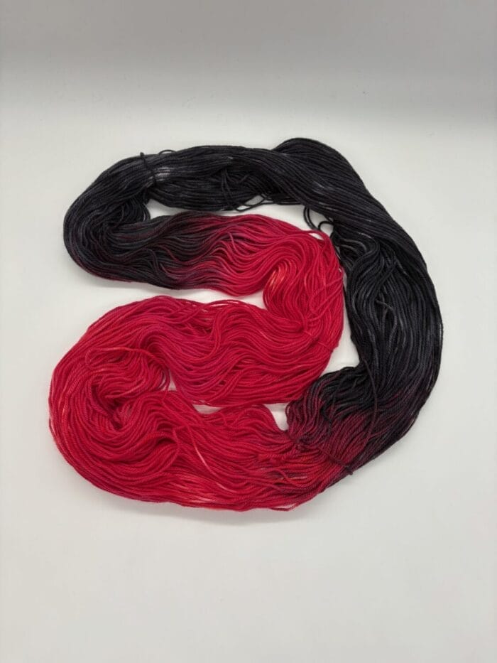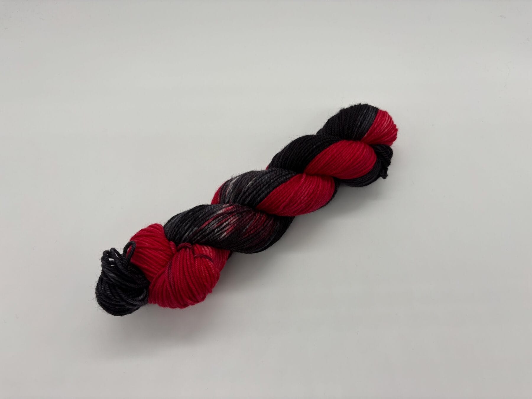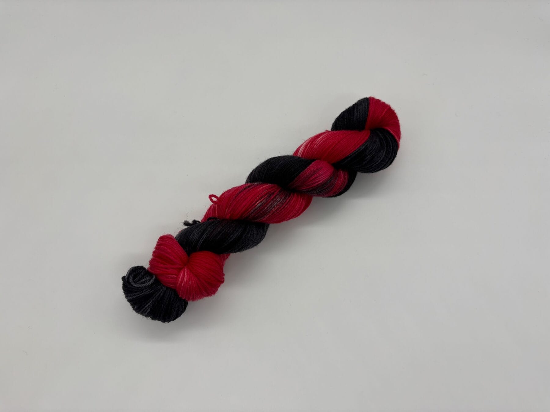 Introducing Harlequin, a striking hand-dyed yarn by Nerds With Needles in Nova Scotia, inspired by the bold and unpredictable energy of Harley Quinn herself. This dynamic skein features an electrifying blend of fiery crimson and deep jet black, creating a dramatic contrast that perfectly captures her mischievous and rebellious spirit.