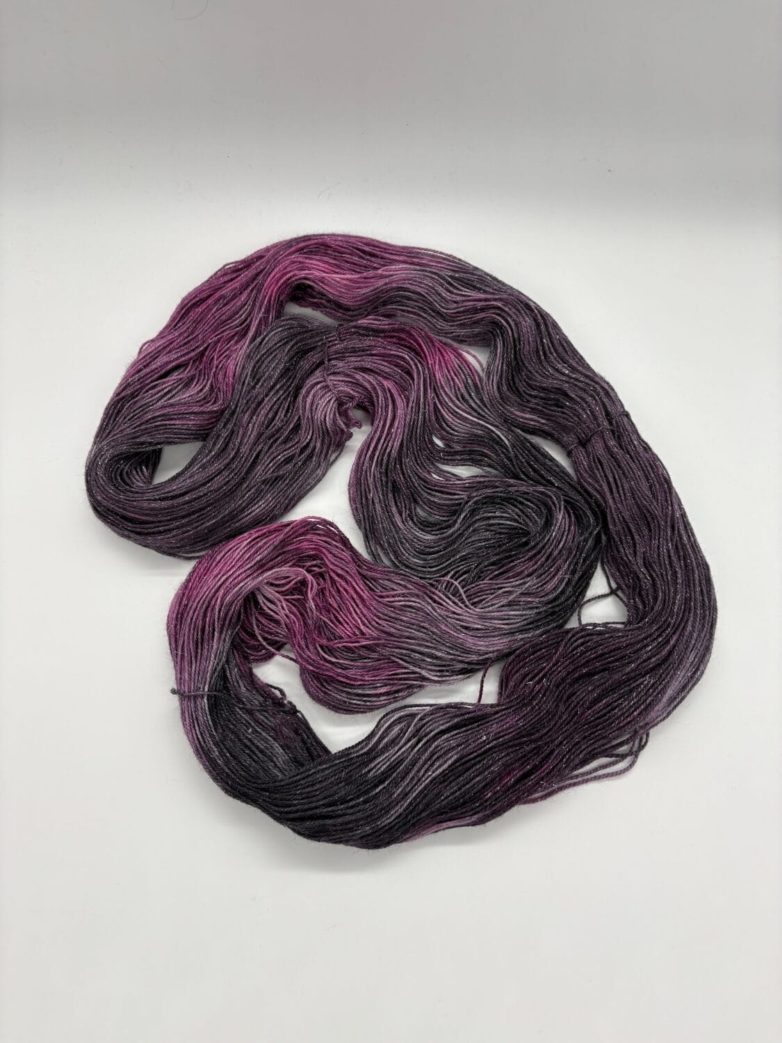 Introducing Invisibility Cloak, a mysteriously enchanting hand-dyed yarn by Nerds With Needles in Nova Scotia. Inspired by the legendary fabric that shimmers between seen and unseen, this skein weaves together deep shadowy blacks, smoky grays, and subtle flashes of enchanted violet and plum—a colorway that shifts like magic in the light.