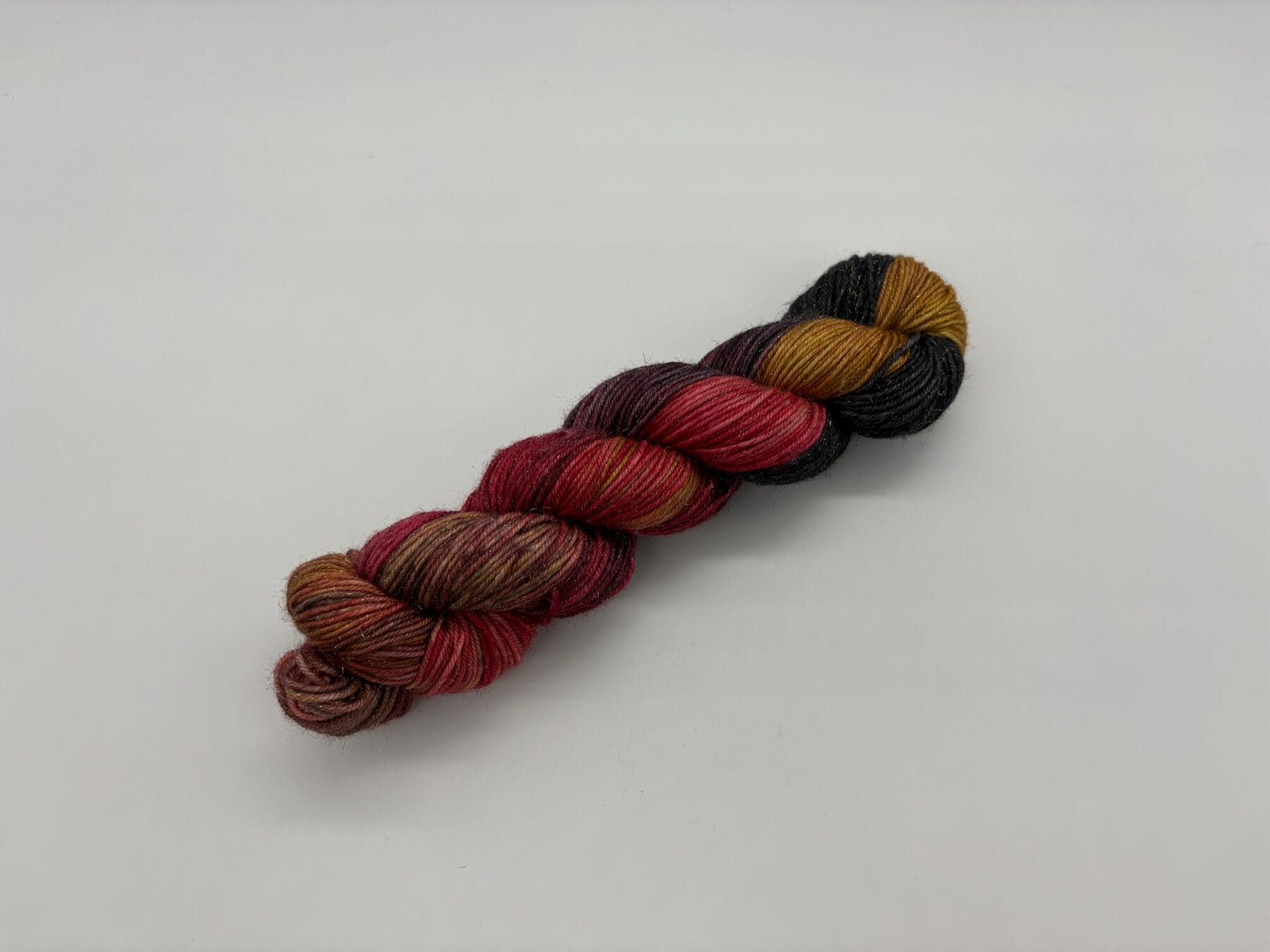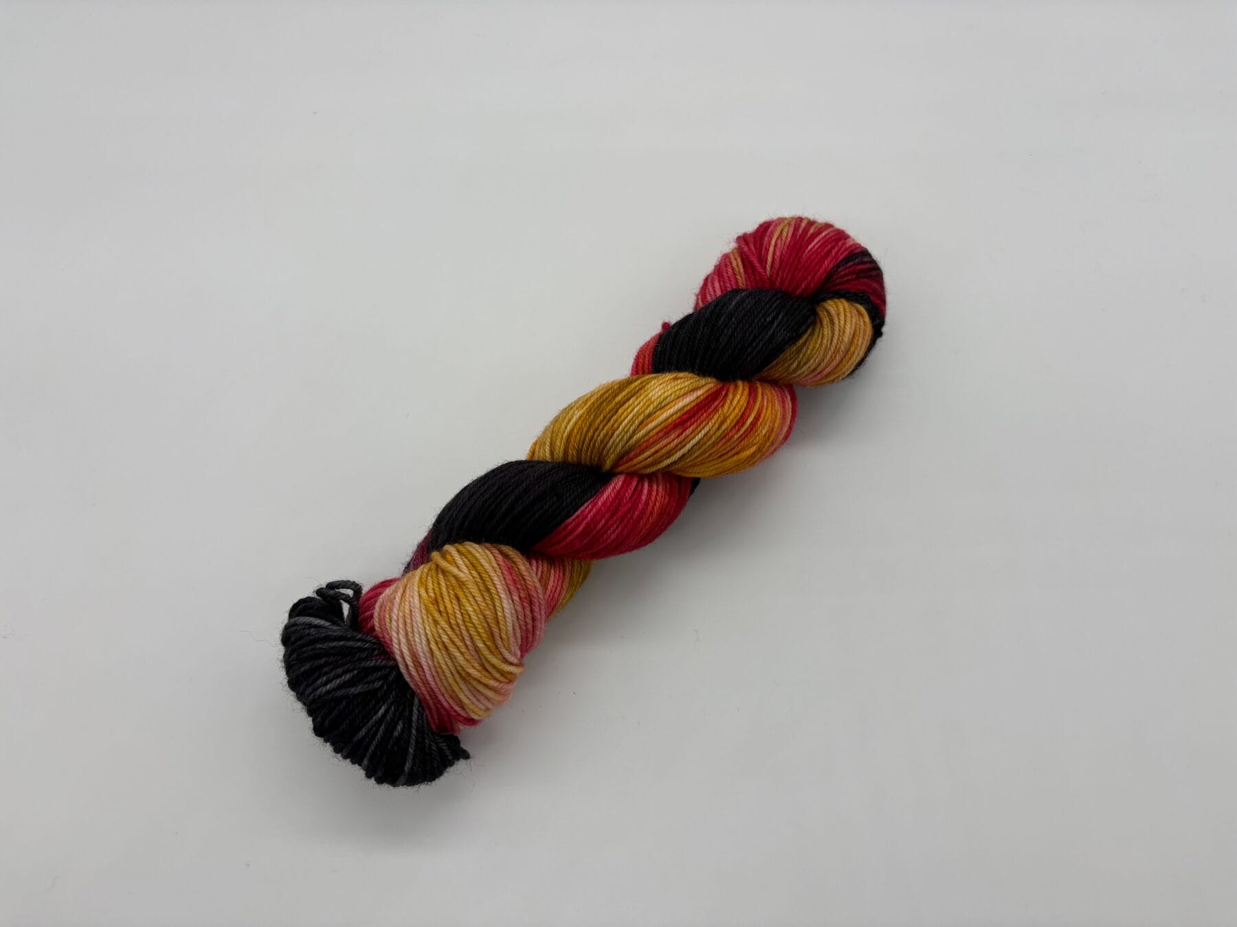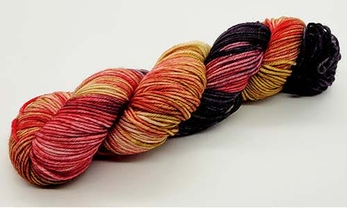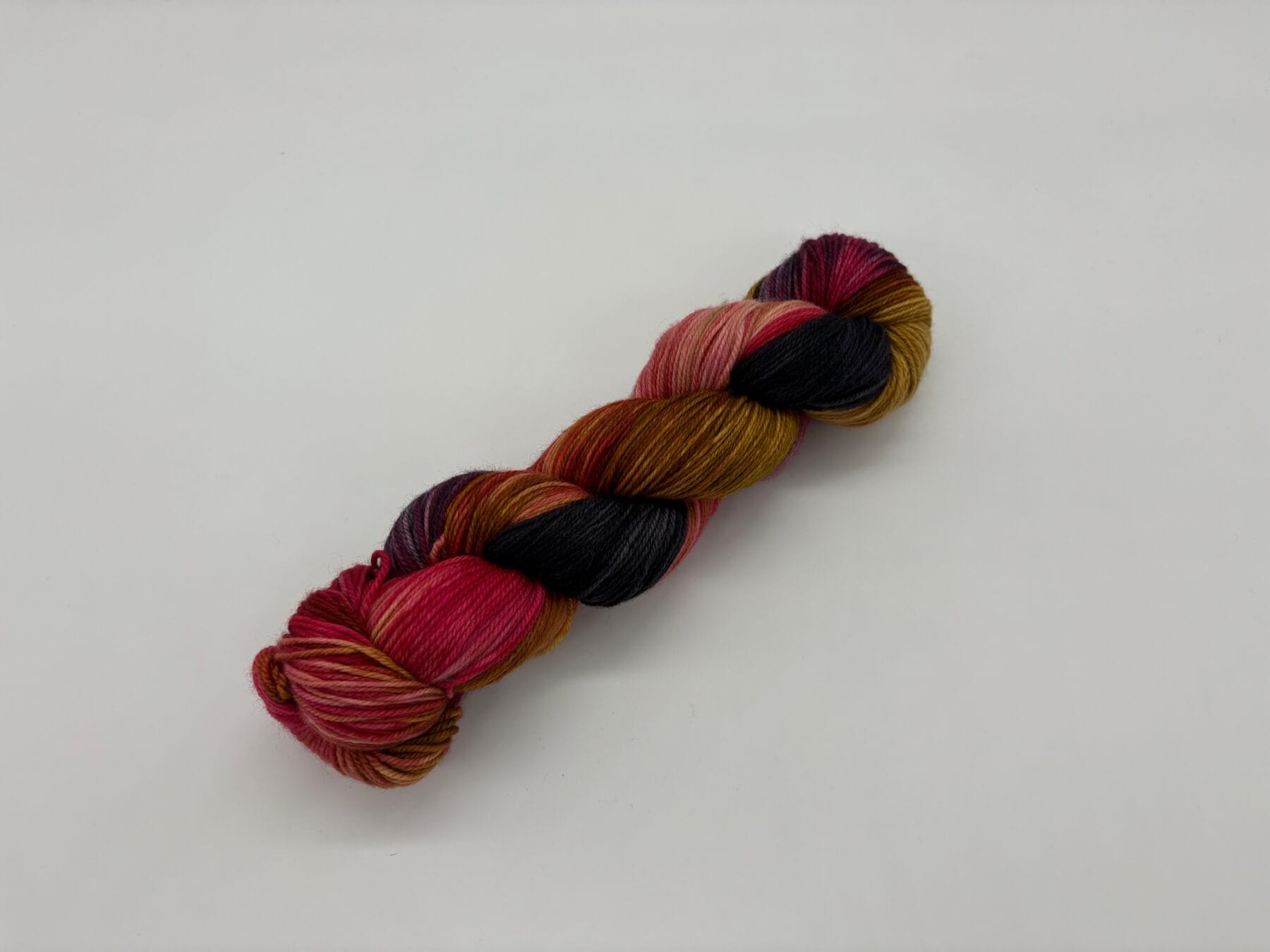 Say aloha to Ohana, a vibrant hand-dyed yarn by Nerds With Needles in Nova Scotia, inspired by the one and only Lilo from Lilo & Stitch. This playful skein blends bold reds, warm golden hues, and deep inky blacks—reflecting Lilo’s iconic Hawaiian dress, the island’s rich landscapes, and the boundless spirit of ohana.