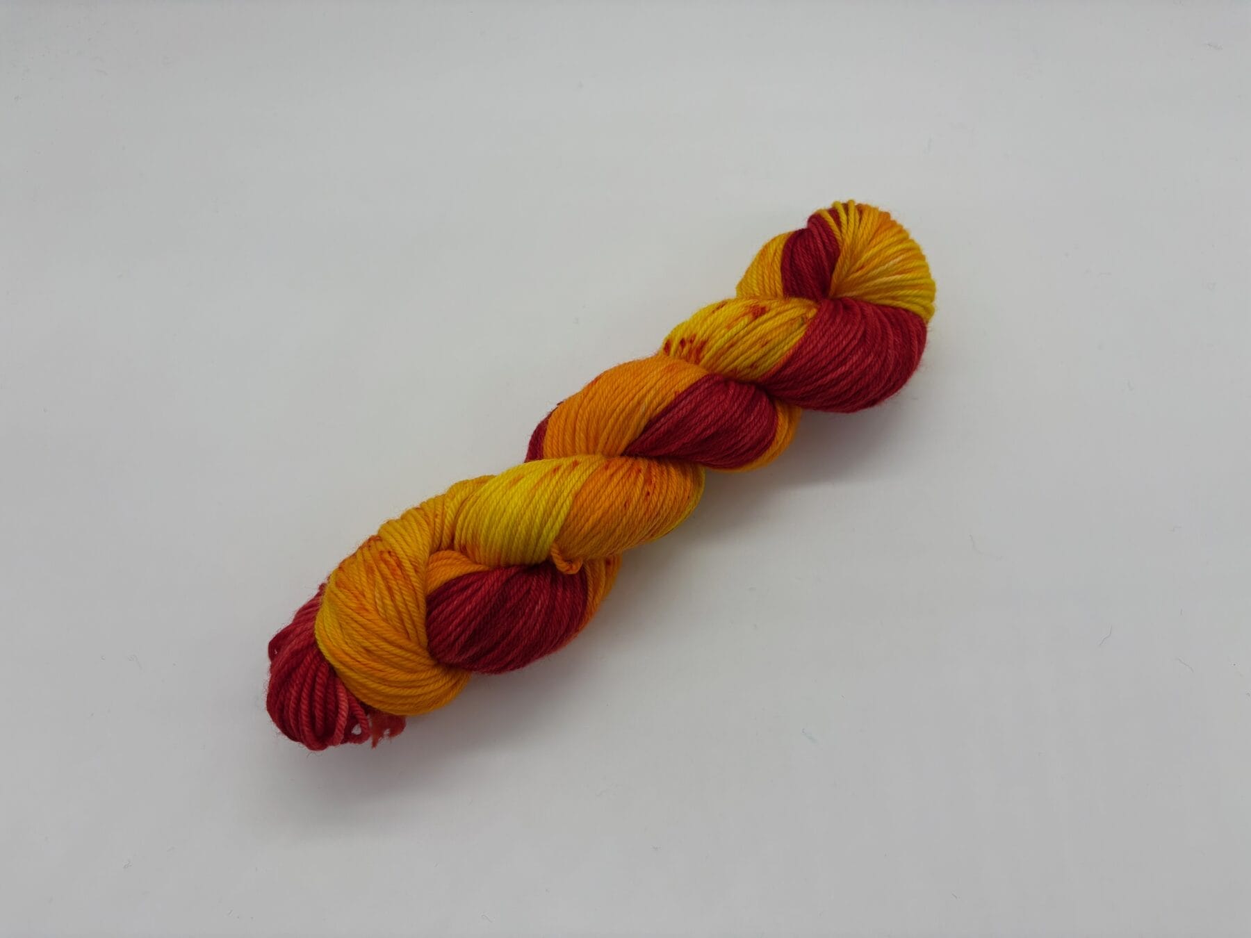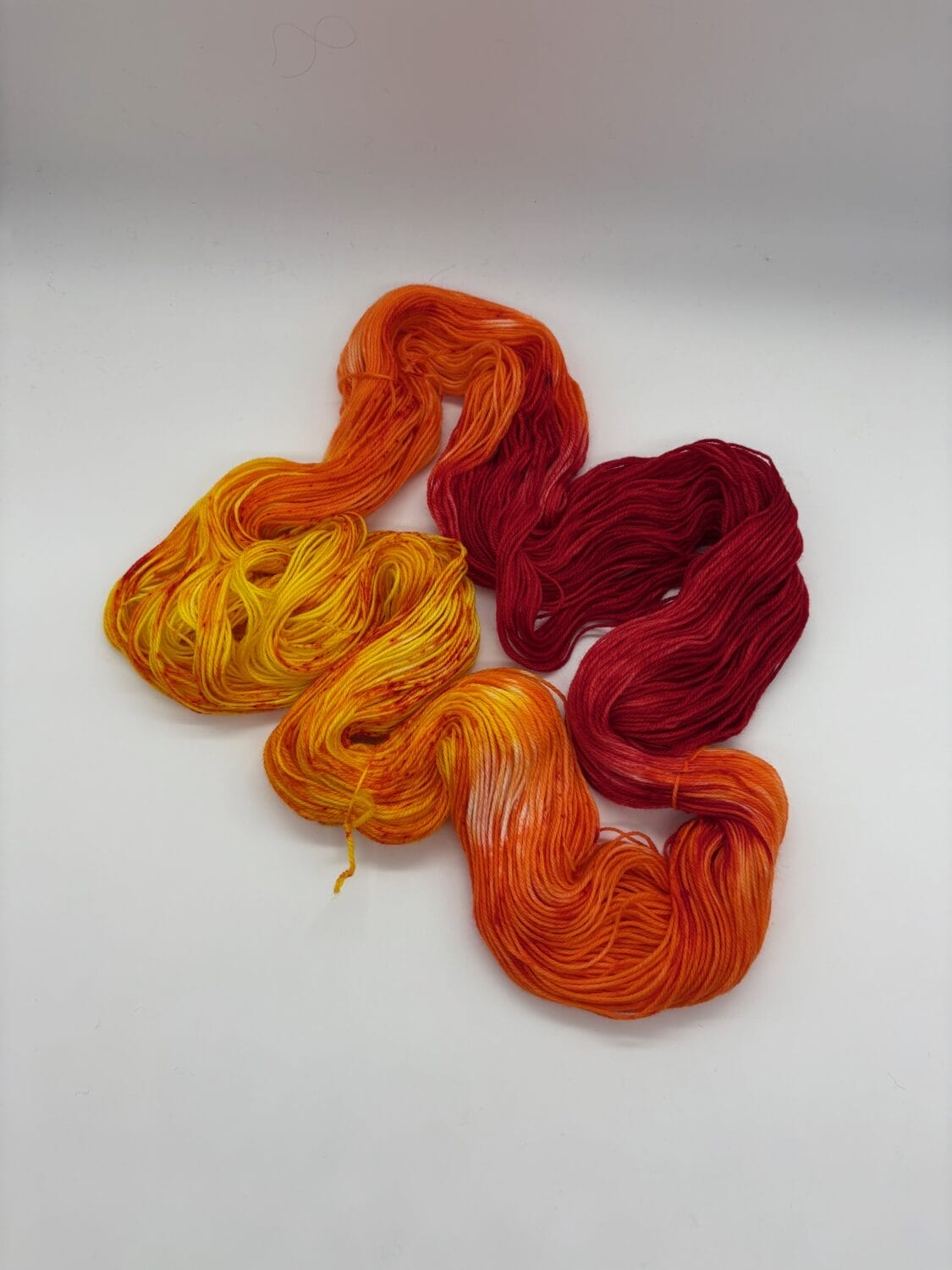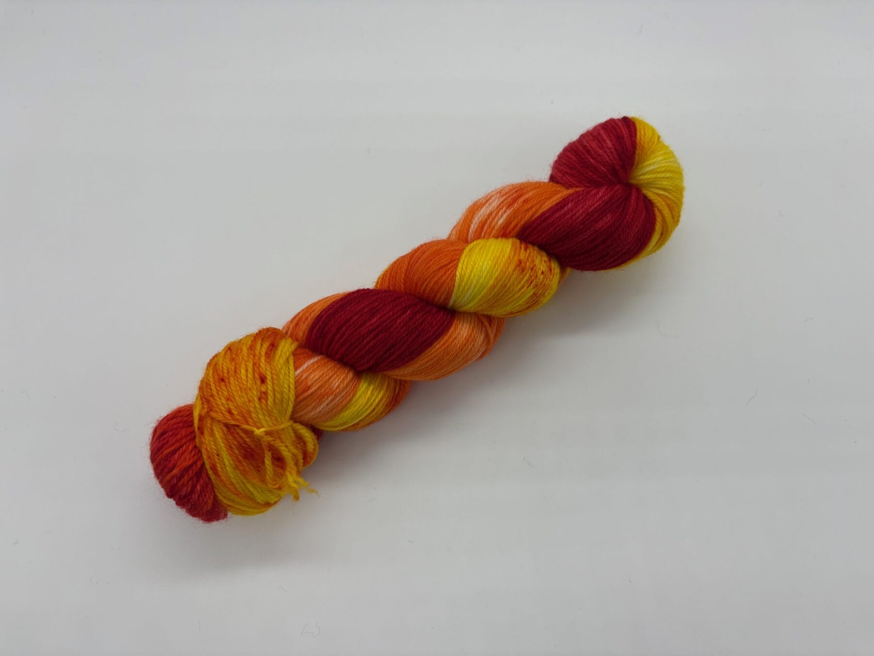 Rise from the ashes with Phoenix, a fiery hand-dyed yarn by Nerds With Needles in Nova Scotia. Inspired by Fawkes, the loyal and majestic phoenix from Harry Potter, this stunning skein blazes with rich reds, glowing oranges, and brilliant yellows—capturing the essence of renewal, resilience, and magic.