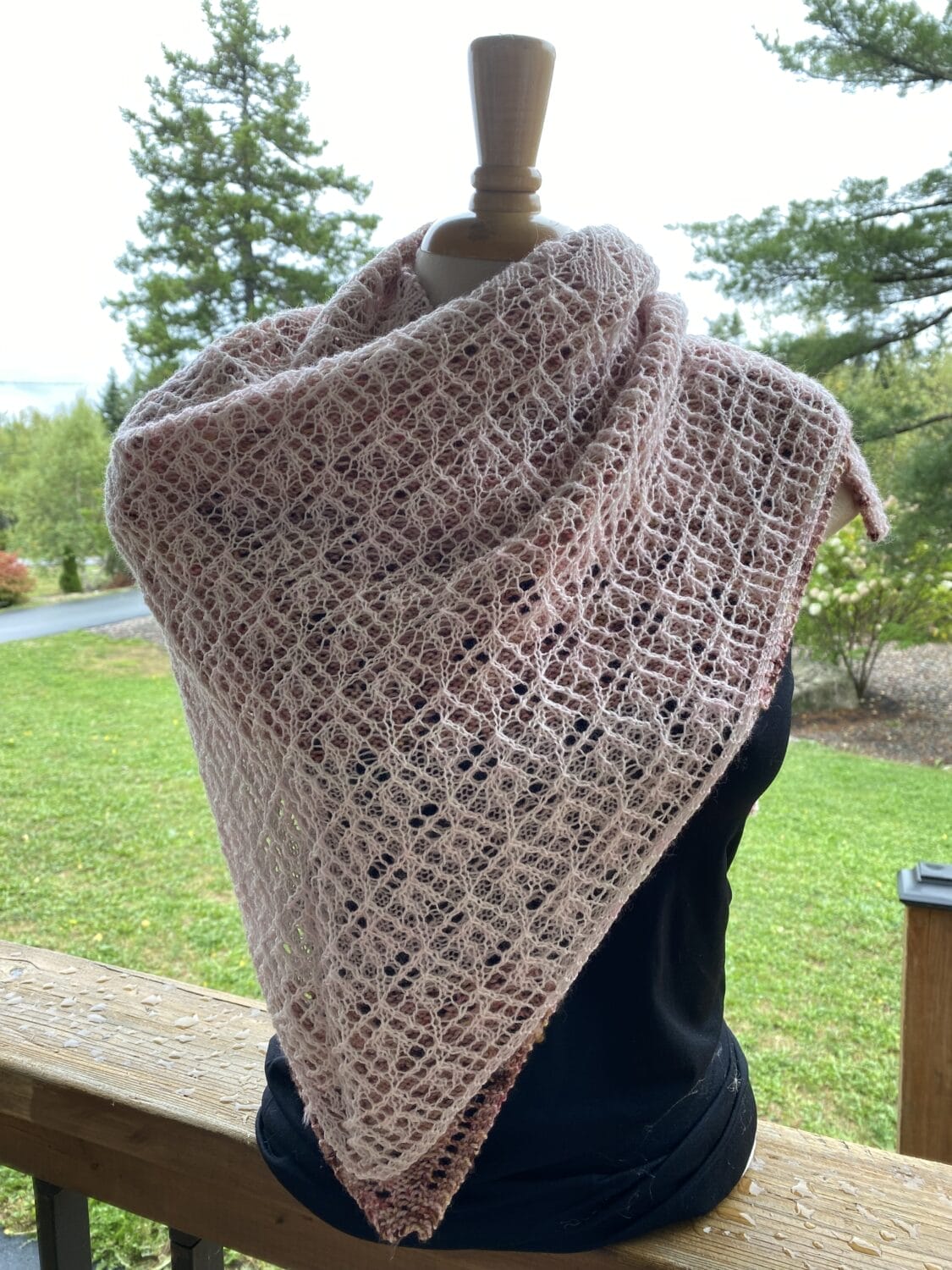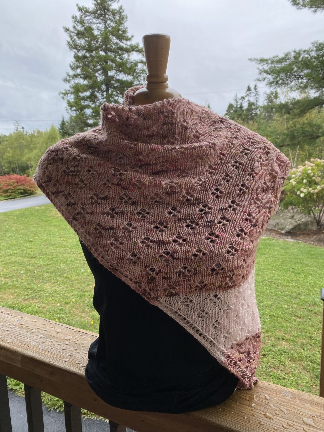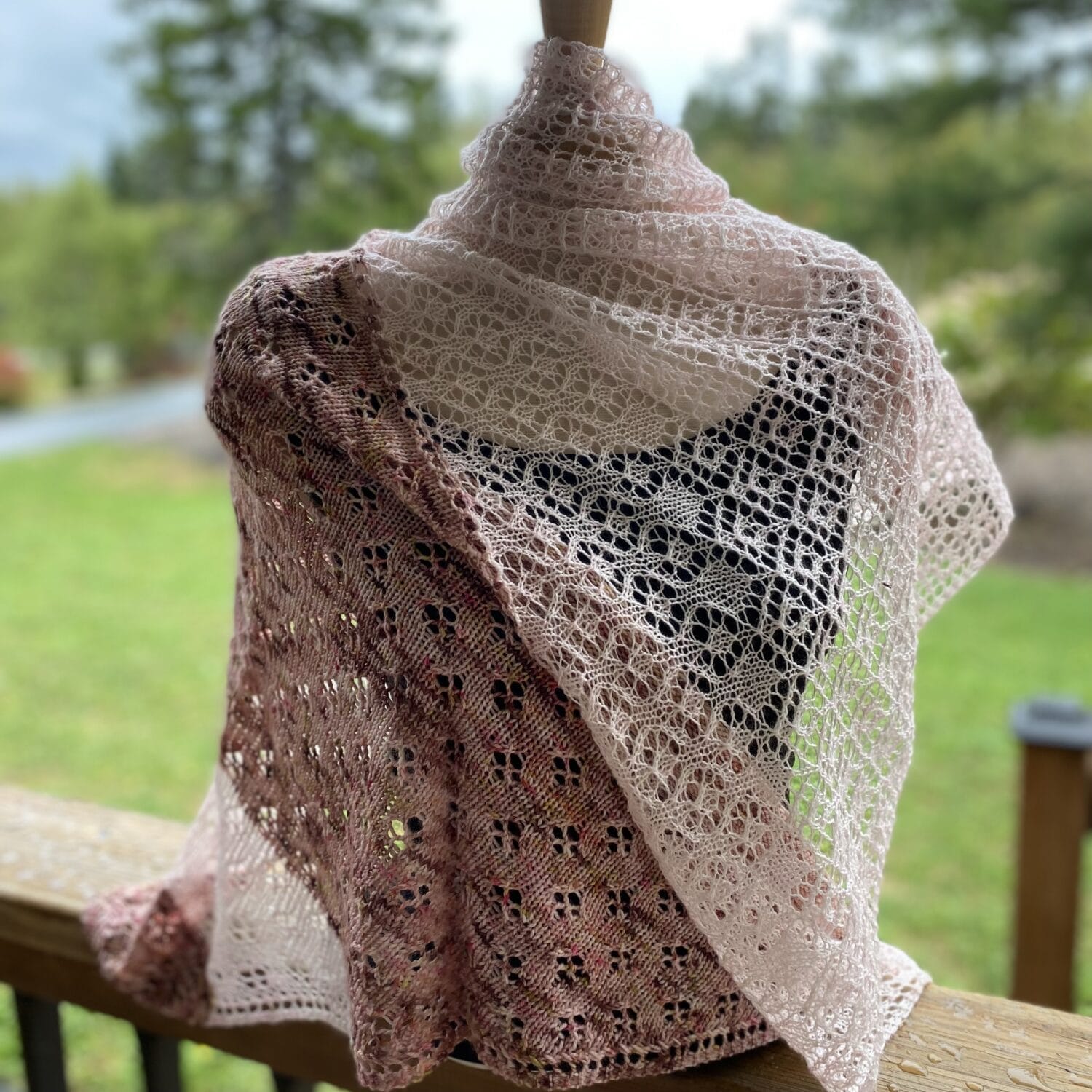 Pairing lace weight yarn with fingering weight for a light and airy, soft and squish-tastic addition to your knit accessories. This shawl in knit in a lacey, modern twist on the shape of a dish cloth to create a square piece. Folded in half, the complimentary colour shows through the lace or can be worn in reverse for two different looks.