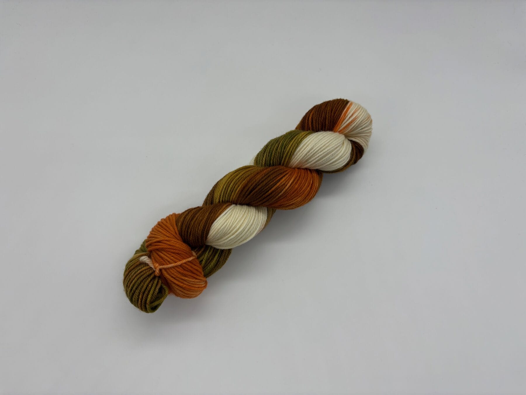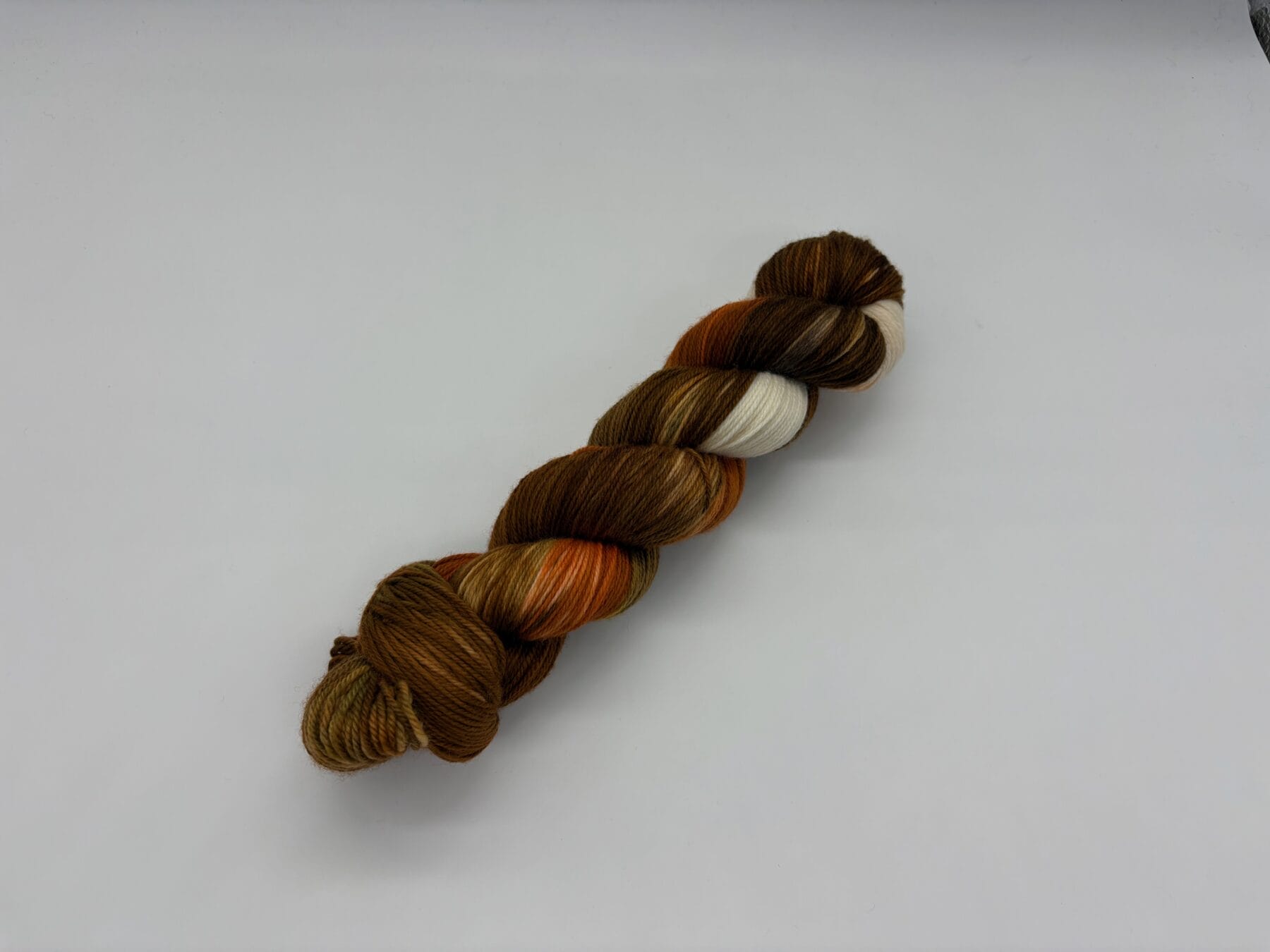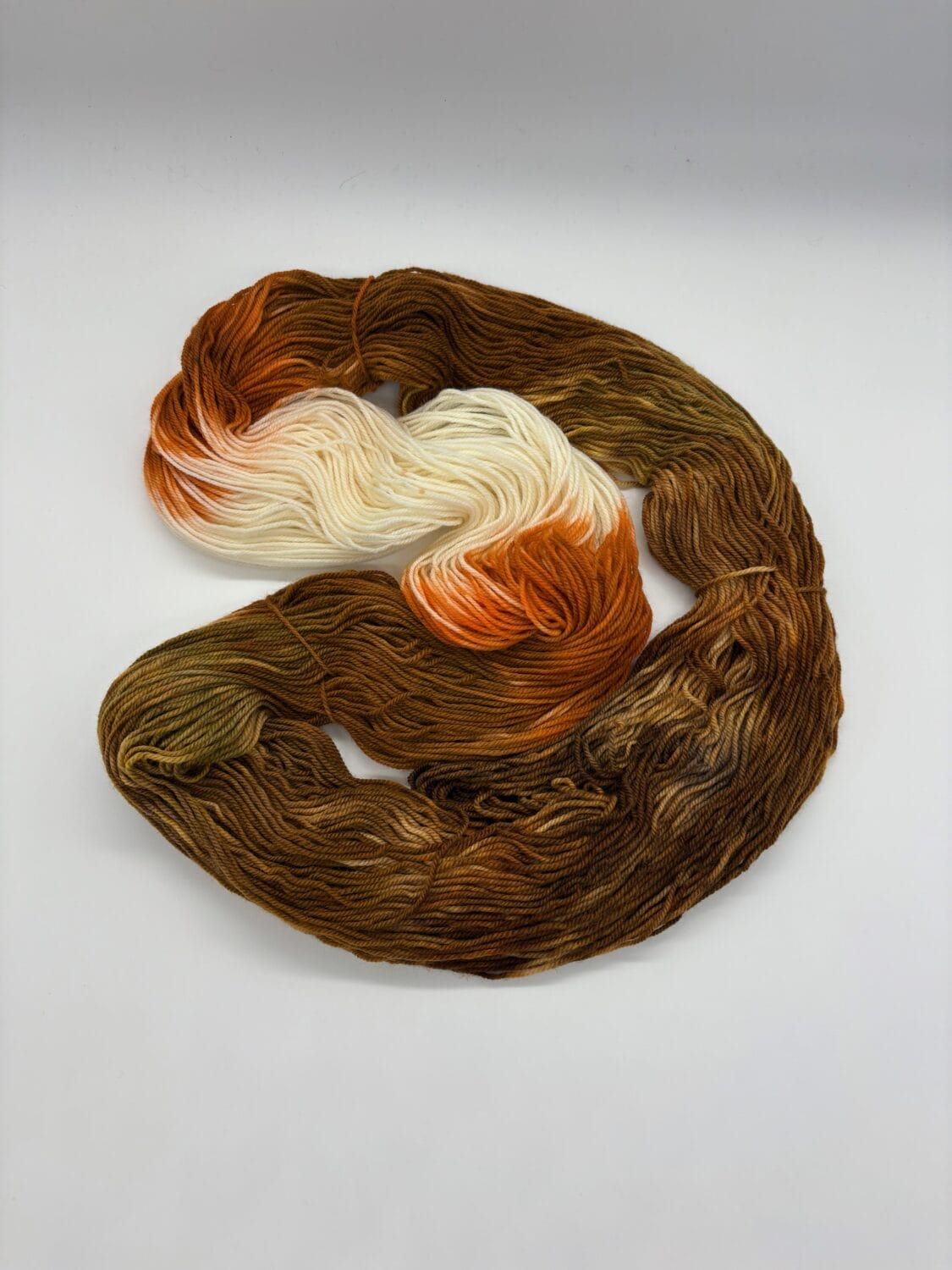Cozy up with Pumpkin Spice, a warm and inviting hand-dyed yarn from Nerds With Needles in Nova Scotia. Inspired by the beloved pumpkin spice latte, this colorway blends rich shades of burnt orange, creamy caramel, and hints of cinnamon brown for the ultimate autumn indulgence. Each skein is dyed by hand, capturing the comforting swirl of spice and sweetness that makes fall so special. Perfect for scarves, sweaters, or any project that calls for a little seasonal magic, Pumpkin Spice will wrap you in the same cozy feeling as your favorite cup of coffee on a crisp morning.