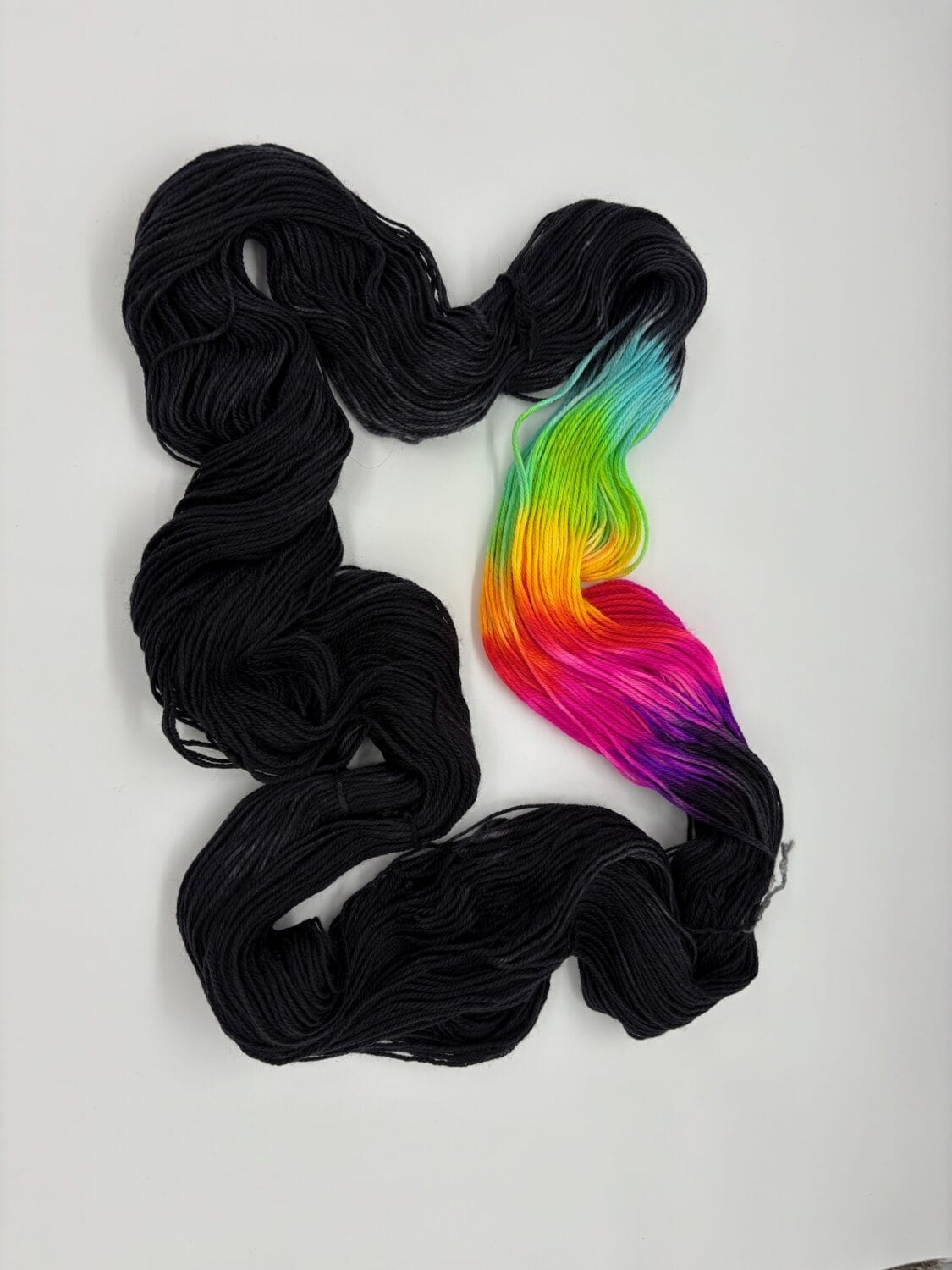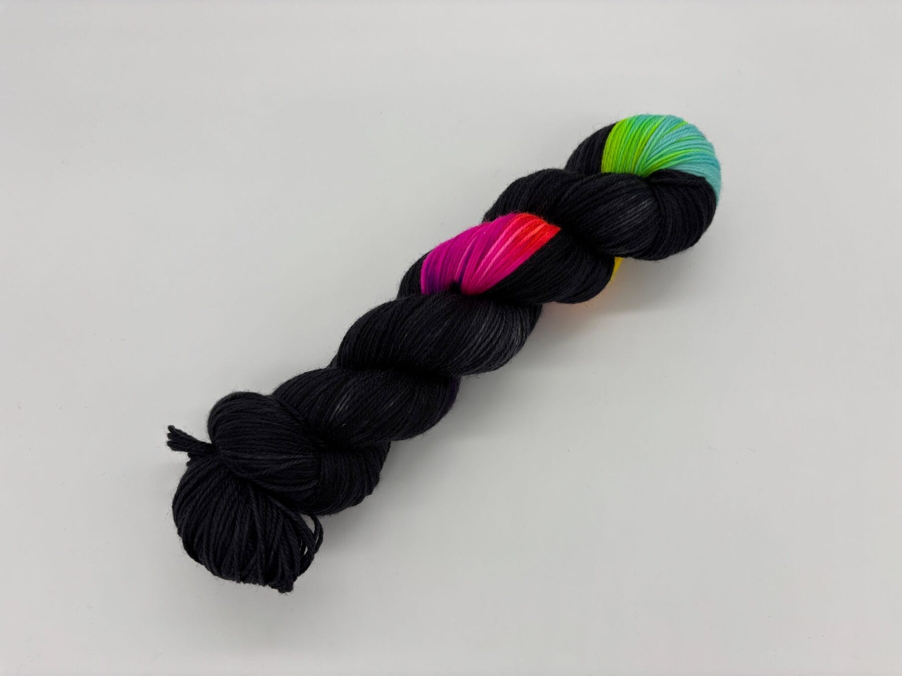 Turn up the volume with Rockerbabe, a dazzling hand-dyed yarn from Nerds With Needles in Nova Scotia. Inspired by Rocker Barbie and her unapologetically glam 1980s style, this colorway is all attitude and sparkle. Bursts of hot pink, electric purple, on a base of rich black come together in a vibrant celebration of big hair, neon lights, and pure pop power. Each skein is hand-dyed with care, making every twist a unique encore performance. Whether you’re stitching a show-stopping accessory or a statement piece that screams confidence, Rockerbabe will have your project ready to take center stage.