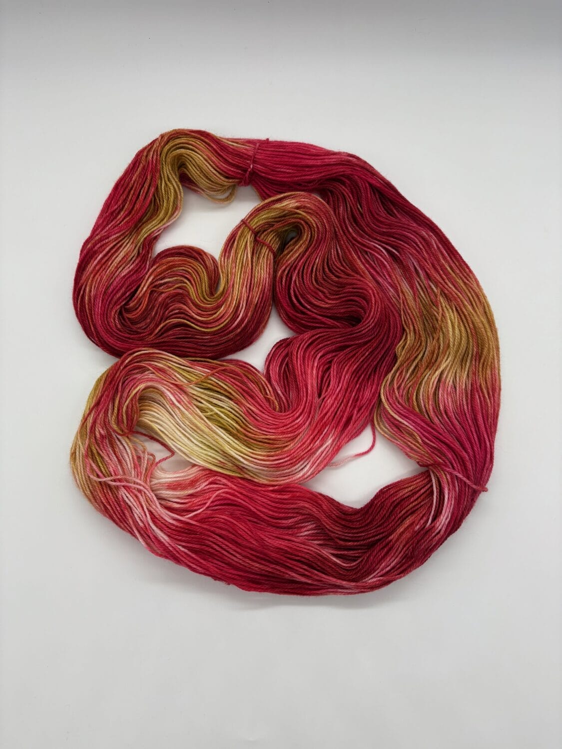 Strength is a bold and fiery hand-dyed yarn by Nerds With Needles in Nova Scotia, inspired by the courageous and daring spirit of Gryffindor. This stunning skein blends deep crimson, warm gold, and rich scarlet hues, echoing the house colors of bravery and determination.